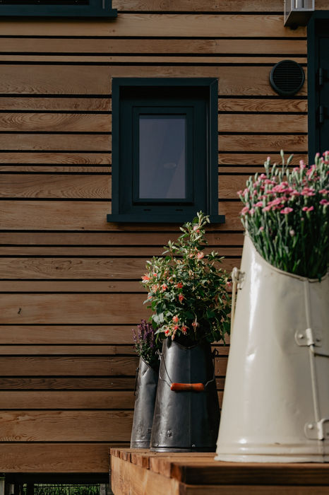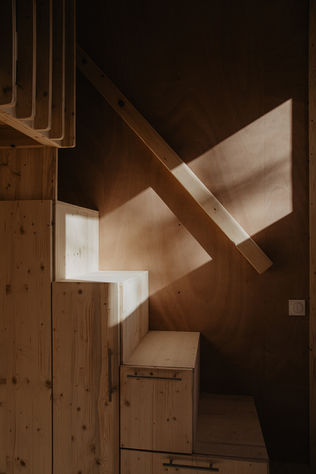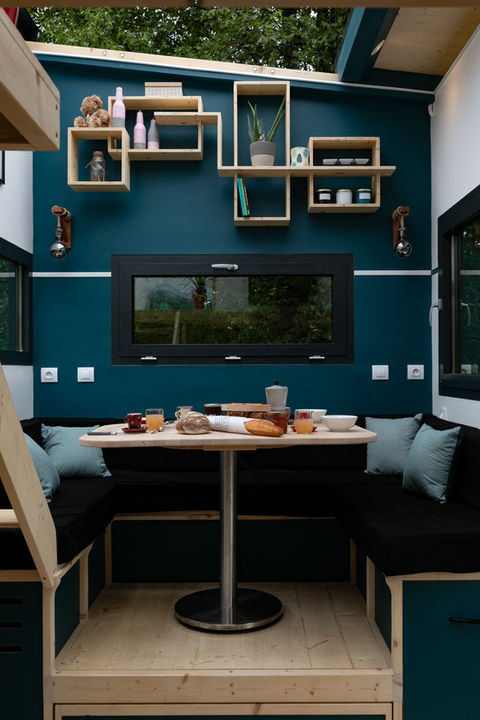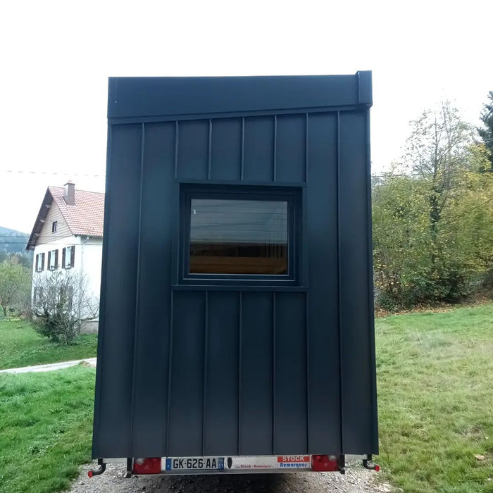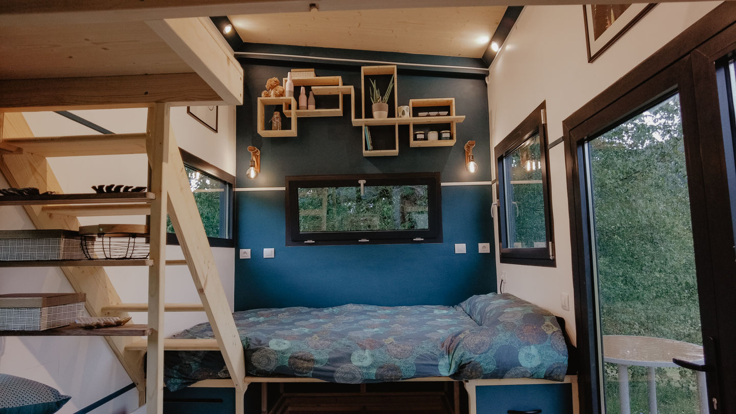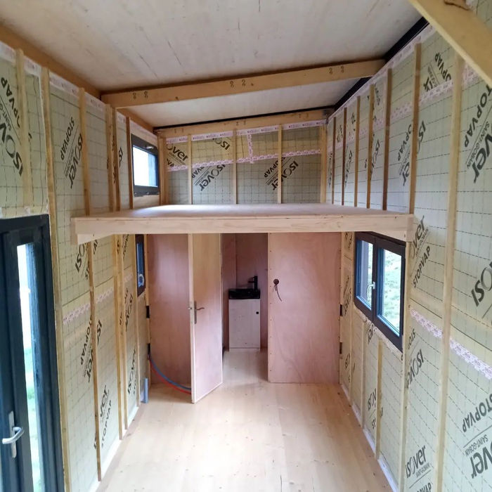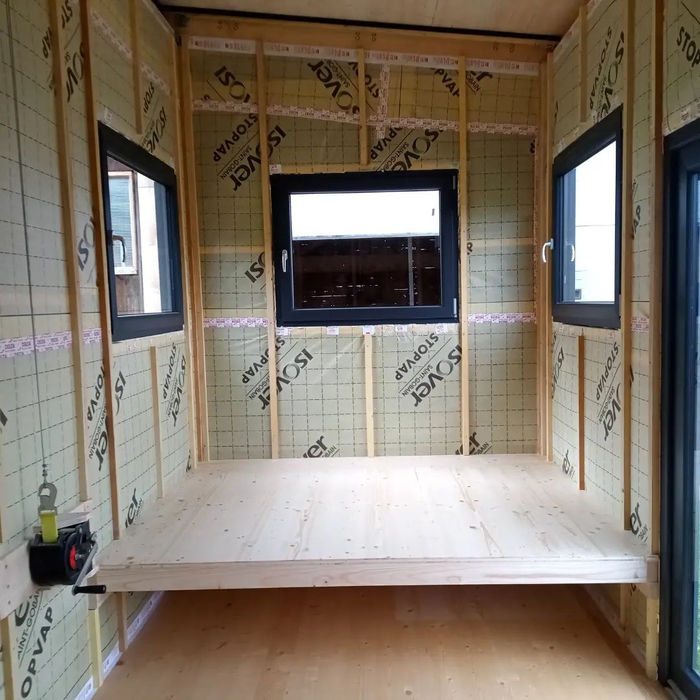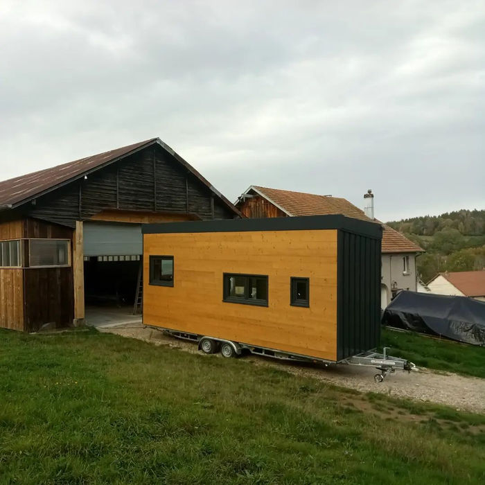 Pour cette Tiny, on arrive une dimension maximale pour respecter le gabarit des 3,5T transportable : elle mesure 7,70 mètres ! Elle à été imaginée en collaboration avec un architecte afin de respecter une architecture particulière : Vastu shastra. Le vastu est l’art d’organiser l’espace de vie selon des lois de la Nature. Rien n’est mis au hasard, positionnement des pièces de vie, dimensions des pièces, couleurs, travail sur les différents flows de lumière. Cette Tiny est équipée de Toit plat en EPDM et d’un bardage clair voie en épicéa thermochauffé. La mezzanine est accessible par un escalier faisant également office de rangement. Un canapé de 190cm est en quelques secondes convertible en lit d’appoint de 140cmx190cm. Les clients ont souhaité réaliser par eux même la partie enduit/peinture et la cuisine.